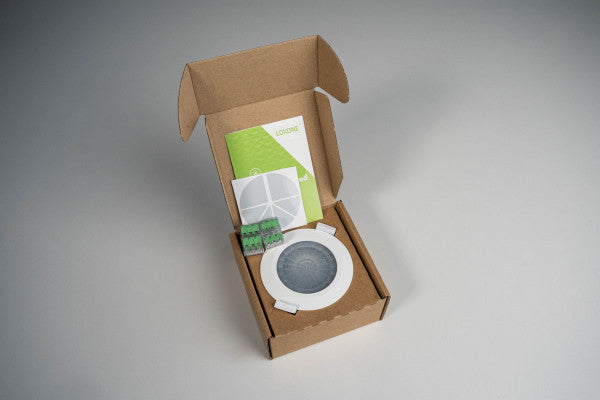 Der Präsenzmelder für den Deckeneinbau zählt an vielen Orten zu den wichtigsten Sensoren der intelligenten Haustechnik. Dank zuverlässiger Erkennung von Präsenz und Bewegung bildet er die Grundlage für die Automatisierung wichtiger Funktionen wie Beleuchtung inkl. konstanter Helligkeitsregelung, Alarm, Musik, Heizung, Lüftung & Kühlung und vieles mehr. Der extrem flache Präsenzmelder passt optisch perfekt zu den Loxone LED Spots und fügt sich so nahtlos in das Gesamtbild ein.